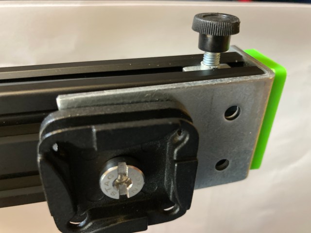 Die Lösung war verblüffend einfach: Der Zahnriemen des Antriebes wird in der Schiene über eine Nut geführt und an der Seite über zwei farbige, grüne Platten abgedeckt, wohl eher aus optischen Gründen und dafür, dass man sich an den eventuell vorhandenen schärferen Metallkanten nicht schneidet. Die Platten wiederum sind über zwei Schrauben am Metall befestigt. Hier können auch die optional zu erwerbenden Füße montiert werden. Und genau hier setzen wir an und nutzen die vorhandenen Gewindebohrungen für unsere Stabilisierung.